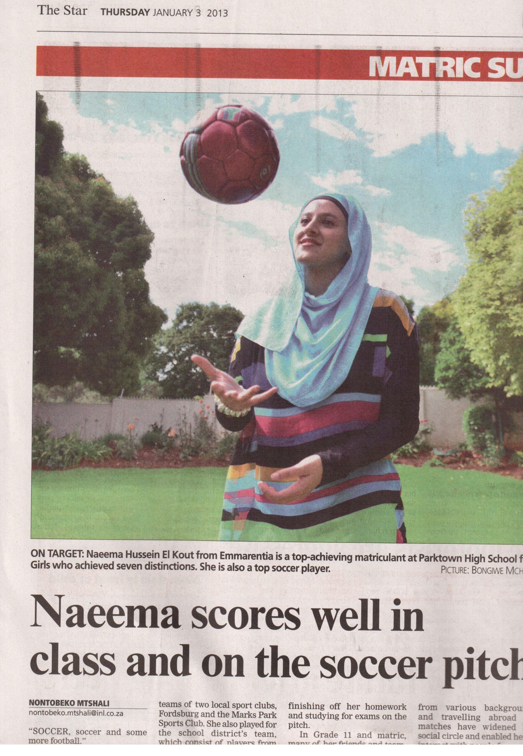 Parktown Girls High School learner Naeema (17) scored 7 distinctions in her Matric Examination and is now confidently looking forward to a host of fruitful activities : studying at Wits University, Johannesburg, to qualify as paediatric physiotherapist or paediatrician, furthering her Islamic studies, reciting the Holy Qur’an, engaging in community service, and of course, playing soccer…overall keeping the balance.